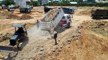 Dump Truck 5T Starting Unloading Dirt For Amazing Bulldozer Pushing into water Build a New Road