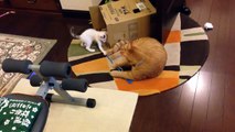 Ce petit chaton montre à son grand frère qui est le patron !