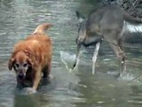 Un cerf s'est approché de ce chien qui se promenait.