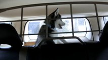 La grille de séparation du siège arrière n'est pas une barrière pour cette femelle husky, maîtresse de l'évasion.