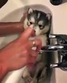 Bañando un cachorrito siberiano