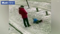 Father kicks his child because he slipped in the snow