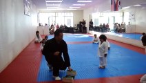 A small baby in an attempt to break in Taekwondo