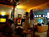 Ada and Hans dancing on the table in Kostas Restaurant in Ialyssos on Rhodes