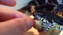 手渡しでヘビに卵をあげる