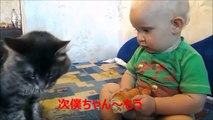 人間の赤ちゃんの遊び相手をしてくれる黒猫
