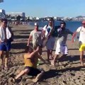 Monkeys pull the man's underwear.....funny