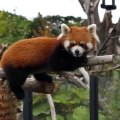 Adorable! Look at this brown panda having fun on a branch.