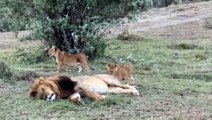 Male Lion trying to rest but his cub have other ideas
