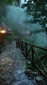 Misty Rainy Forest Path with Lantern-Lit, Rustic Stone Walkway, Wooden Railings, Lush Green Canopy.