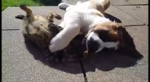 互いに譲らぬへそ天合戦、日なたに転がる猫と犬