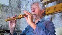 Georges Collombat explique les mathématiques sur des tablettes de bois