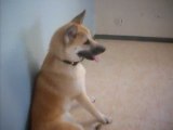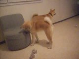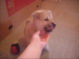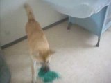 Un chiot joue avec un glaçon
