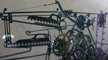 la pendule a billes, création avec des pièces de vélos qui donne l'heure par le nombre de billes disposées sur les rails, heures, x5 mn, mn et fonctionne 5 jours par l'inertie d'un poids de 30 kg