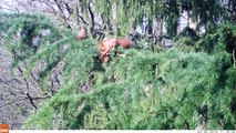 5 mars 2014, après avoir bouloter deux cônes d'un cèdre des Hauts de La Gravière dans la Ceinture verte de Sainte-Foy-lès-Lyon, un écureuil roux se retire lestement.