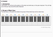 There are seven white keys and five black keys in one octave, this pattern is repeated throughout the piano keyboard. Learn these pattern so that you can easily recognize the names of each piano key in relative to its position on the piano keyboard. Click on the link above to go to the Fun lessons with Flash demos.