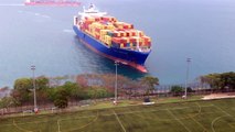 Container Ship Sails Straight to Shore by University Football Field