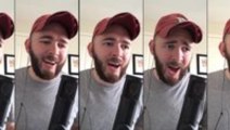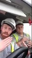 Construction worker sings a song on his break.