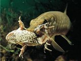 Autumn pike fishing on top woter frog. Silicone Frog on pike.