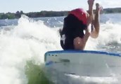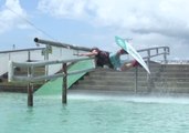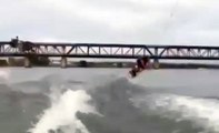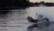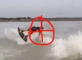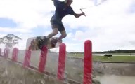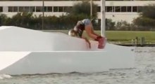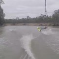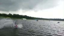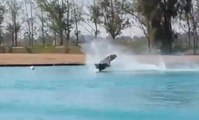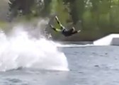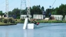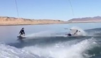 Two wakeboarders collide while riding doubles at a cable park.