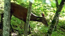 Une biche broute paisiblement, malgré les mouches