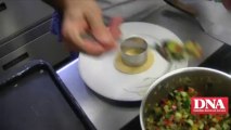 En ouvrant leur propre restaurant en décembre 2015, Julien Binz et sa compagne et associée Sandrine Kauffer ont clairement fait le choix de la cuisine gastronomique. « Nous avons volontairement restreint le service à 25, 30 couverts », indique le chef dont l’objectif est d’obtenir l’étoile Michelin qu’il détenait au Rendez-vous de Chasse de Colmar. Dans sa cuisine du restaurant Julien Binz, à Ammerschwihr, il est entouré de deux chefs de partie : Elie Clauzade avec qui il cuisine viandes et poissons et Morgane Brucklert, en charge des amuse-bouche, entrées et desserts. En salle, il peut compter sur François Lhermitte, maître d’hôtel et chef sommelier. Pour les DNA, il réalise un damier de sardines marinées tomate-avocat, coulis basilic.