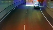 Ce motard esquive un matellas dans un tunnel