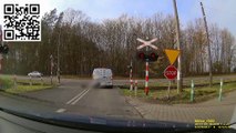 Une voiture passe sur une voie ferrée alors qu'un train arrive