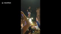 England fan whips crowd into frenzy after scaling lamppost