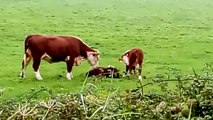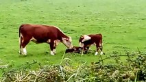 Mother cow washing her calf her other calf starts licking its side