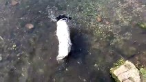 Young swans paddling and sticking their beaks under the Water at Fishbourne creek