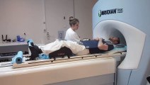 Un technicien endosse le rôle d'un patient pour montrer le fonctionnement du MRIdian Linac