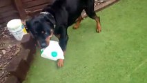 Rottie known as a rottweiler big dog breed very loyal and protective out of all the toys he as the best one he plays with all the times is a plastic bottle and he will chew on it for hours he waits till the bottles empty then he begs for yhe empty bottle he will sit and watch for hours waiting for the empty juice bottle.