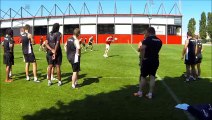En ce 18 juin, les joueurs du LOU Rugby ont reçu la visite exceptionnelle d'un ancien champion du monde de Boxe, Fabrice Tiozzo. Une discipline qui, sous ses "ordres", s'est parfaitement greffée à la séance d'entraînement des lyonnais.