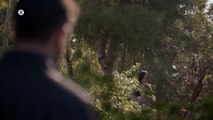 Εν τω μεταξύ στο νησί, σε έναν καταυλισμό προσφύγων, φωτιά ζώνει τις σκηνές.