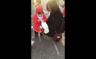 a litle child steals food from a pigeon