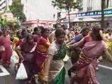 Voici en plusieurs vidéos très courtes, le défilé à Paris, le 31 août 2008, pour la fête de Ganesh, dieu indien à tête d'éléphant, fils de Shiva et de Parvati: joueurs de flûte, de tambour, chars tirés séparément par des hommes et des femmes, pieds nus sur la chaussée arrosée avant leur passage, danseurs portant un arceau de plumes de paon ou des pots de terre cuite où brûle du camphre, offrandes et noix de coco brisées à terre. Sur leur passage, autels et tables d'offrandes devant les boutiques indiennes du 18e, distribution de nourriture et de boisson.