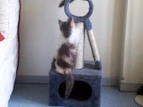 Chaton jouant avec une fausse souris sur arbre à chat