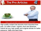 TheProArticles is the best resource for article marketing. We are a reputable articles directory to find and submit articles for free. Submit your best online articles for more exposure, traffic and back links.