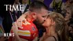 Taylor Swift and Travis Kelce Celebrate Super Bowl Win with a Kiss