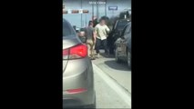 2 guys are fighting on the road