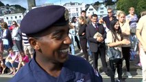 Dartmouth Regatta Waiters and Waitresses Race on the Boat Float Bridge Dartmouth U.K.