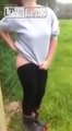 Naked ass of American girl and fence with electric voltage