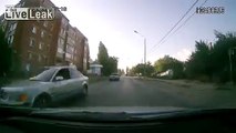 Cop biker goes flying in the air trying to run a red light