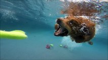 Golden Retrievers Campbell & Rusty swim underwater for dog toys