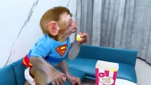 Monkey Baby Bon Bon Goes to Buy Giant M&M Candy and Eats Ice Cream with Puppy in the Garden