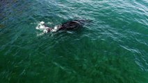 A close up view of a Southern Right Whale swimming under water, off the coast of Cape Town.