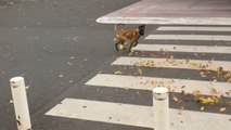 Curious pup jumps into swirling leaves on the road and spins with joy