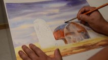 Painting a landscape with barn in water color.