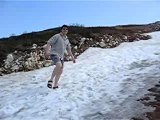 walking up a ski slope in sandals